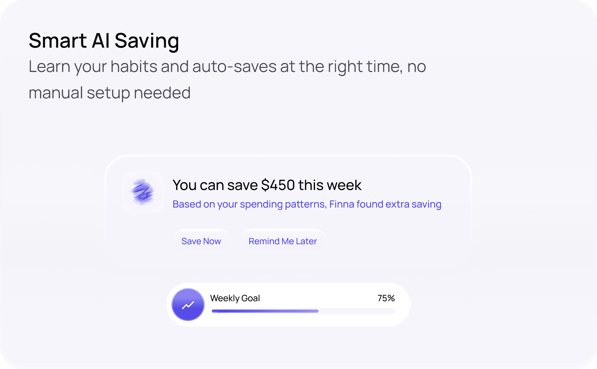 Finna helps you save consistently with smart automation and behavioral science. It learns your patterns, nudges you at the right time, and grows your savings quietly in the background